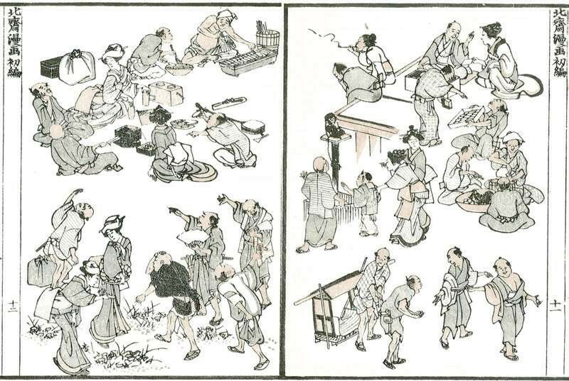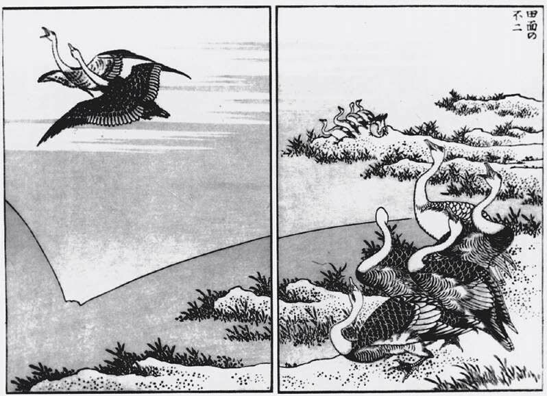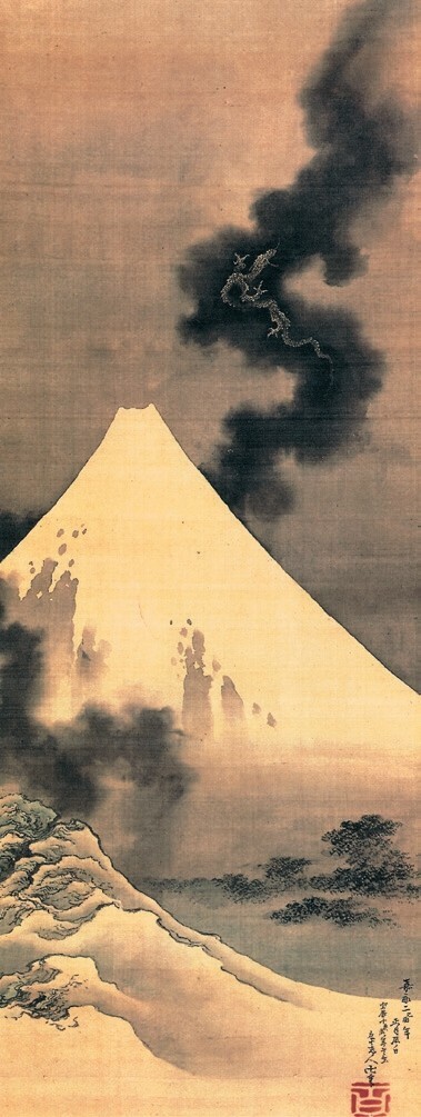 葛饰北斋晚年还作有白描绘本《富岳百景》,1834年(天保五年)起分三册先后出版,共120幅版画,人物千姿百态,构图奇趣盎然,线描功力精坚。这是继《富岳三十六景》之后,葛饰北斋对富士山长年来的敬仰与表现欲望的集大成之作,对此他曾说道:“我真正的画诀尽在此谱中。”此外,葛饰北斋终身没有停止过手绘,晚年的几幅堪称经典。《富士越龙图》是葛饰北斋作于1849年(嘉永二年)他生命最后时期的近乎绝笔之作,白雪覆盖的雄伟富士山,万籁俱寂中一条飞龙横空出世,烟云缠绕直上九霄,从中读出了葛饰北斋不老的灵魂及其渴望永生的境界。