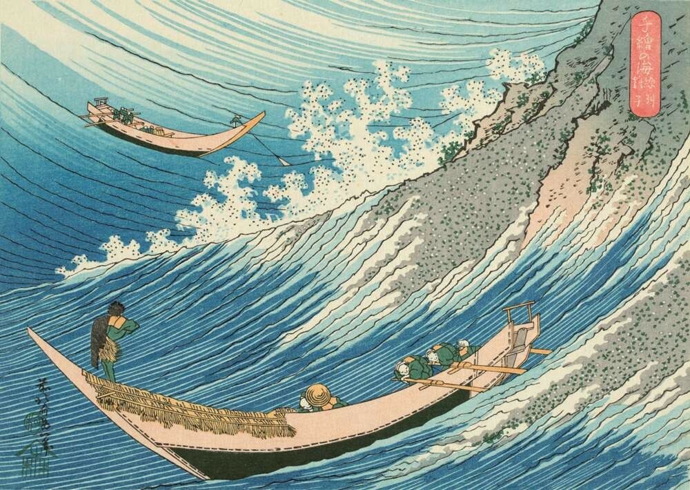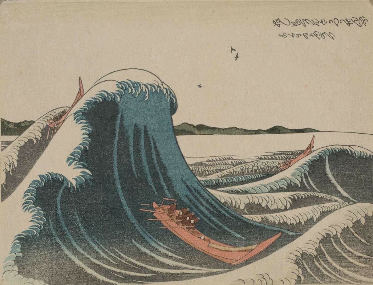 这个系列中的《神奈川冲浪里》一幅举世闻名。神奈川冲是从三浦半岛到横滨附近的江户湾沿岸海面,从这个角度可以眺望到与画面相似的远景富士山。画面上有3艘押送船,它们是从江户附近的房总半岛运送鲜鱼和蔬菜到江户城日本桥市场供应市民的船只,每艘船上有8名桨手。大海汹涌澎湃,波浪破碎的一瞬间,船夫们紧紧抱住船身随波逐流。翻滚的浪花又引导观者的视线,使处于画面下端的富士山雄姿不减。