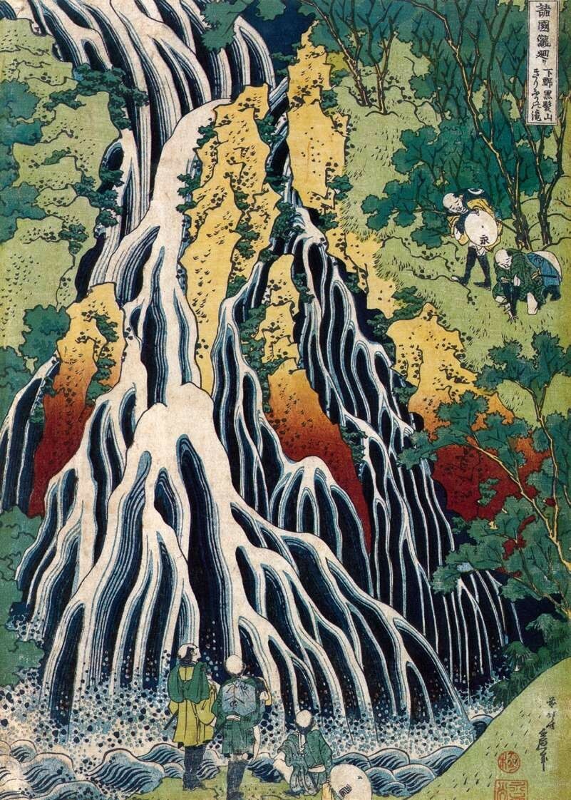 溪斋英泉的风景画也可见“兰画”的影响。他融合铜版画与日本传统绘画技法,准确的透视效果具有西方近代绘画的魅力。他还善于在画面渲染大自然的诗情画意,以写实技法体现日本传统的自然观和东方文化的特征,代表作有《江户八景》和《日光山名所之内》等系列。1829年(文政十二年)市面上开始出现从海外输入的化学颜料“维尔林蓝”,在价格上较之传统的植物性版画颜料便宜许多。溪斋英泉使用这种颜料制作了蓝色套版团扇绘,被称为“蓝拓”。他将这种技法广泛运用到他的风景画中,成为19世纪三四十年代江户浮世绘的流行手法。随着幕府政权对进口书籍输入限制的放松,西方铜版画以书籍插图的形式大量进入日本,对浮世绘风景画产生了深远影响,而真正使风景画走向成熟并享誉海外的则是葛饰北斋与歌川广重两位大师。