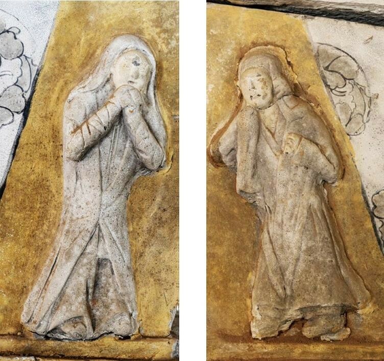 唐代的一幅哀悼者图像,见于太原南郊金胜村新安焦化厂唐墓,描绘一名身穿宽袍的老者,面对一个坟丘掩面痛哭(图8.22)。这类图画俗称“树下老人像”,一般出现在围绕棺床的屏风壁画里。学者对其内容有不同看法,或认为表现的是历史人物,或提出描绘的是丧葬礼仪。无论其内容如何,这类图像都足以显示,个体悼亡者形象在早期中国艺术中已经存在,并以“举袖掩面”作为表达哀伤的典型姿势。