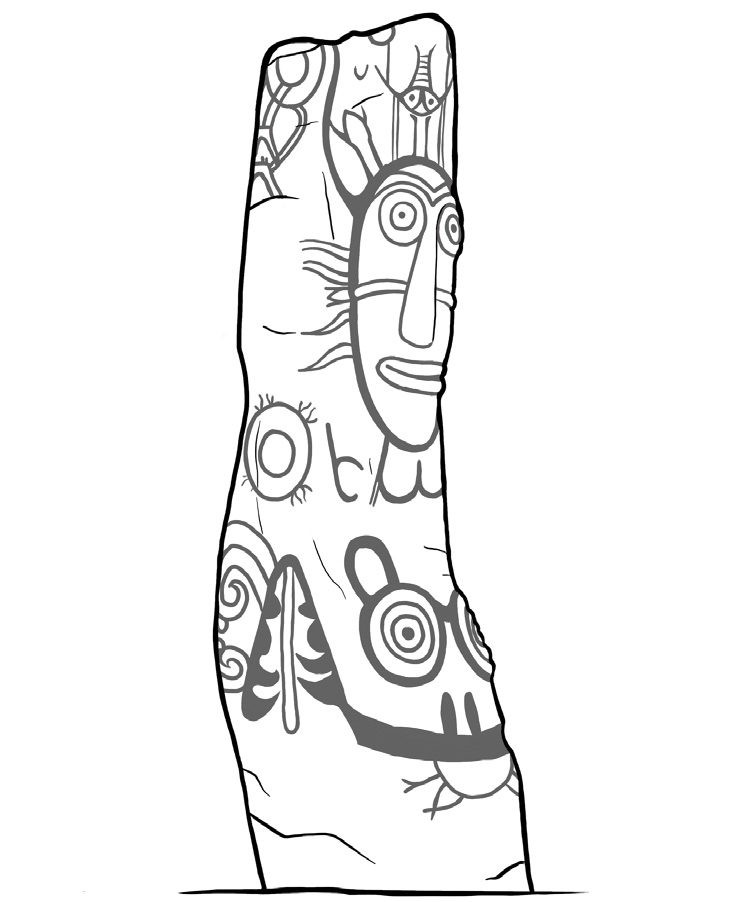 图5.3 立石,属于奥库涅夫文化,从哈卡斯共和国的安查诺夫遗址中复原。它描绘了一个类人的形象,头部有光线环绕;蛇状的触须和圆形纹样装饰着身体。在这个人像左肩旁还有一张更小点的脸(它也是奥库涅夫文化的典型纹样)