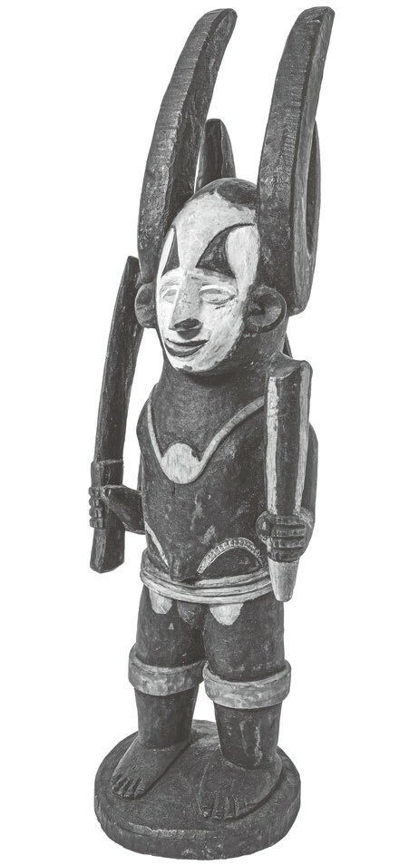 图8.5 尼日利亚伊格博人的伊肯加雕像,出自奥卡的阿莫比亚地区——这座城市以锻工出名。伊肯加雕像展现的是作为个人成就化身的灵,它们表现出了伊格博人的优势与权力,其中就包括锻工。这尊雕像颂扬的是人类右手的力量,他的右手握着一把刀,左手则握有象牙。公羊角进一步地象征了力量和凶猛。伊肯加需要人们为其供上食物,以科拉(kola)酒祭养,尤其是在人们完成需要力量的工作时