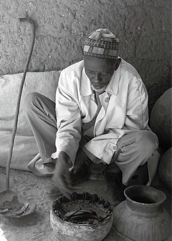 图8.8 一个正在进行恩刚(nggàm)活动的人——这种活动通过解读淡水蟹改变的物品位置来预测未来(拍摄于喀麦隆的鲁牧斯基)
