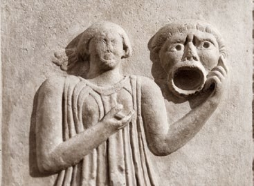 使用这些面具的古人从不混淆它们与真实人脸的区别,因此面具或假面(mask)总含有伪装和矫饰的意味。一幅罗马浮雕显示一名女子以左手举着戏剧面具(图8.2)。虽然它大张的口、目,以及眉间皱褶都在表达哀痛,但与日本伎乐面具一样,将情感转化为脸谱。这也正是这块浮雕的含义:女子以右手指着面具,告诉观者将它与自己的真实面容对比,面具呈现的只是伪装的表面。