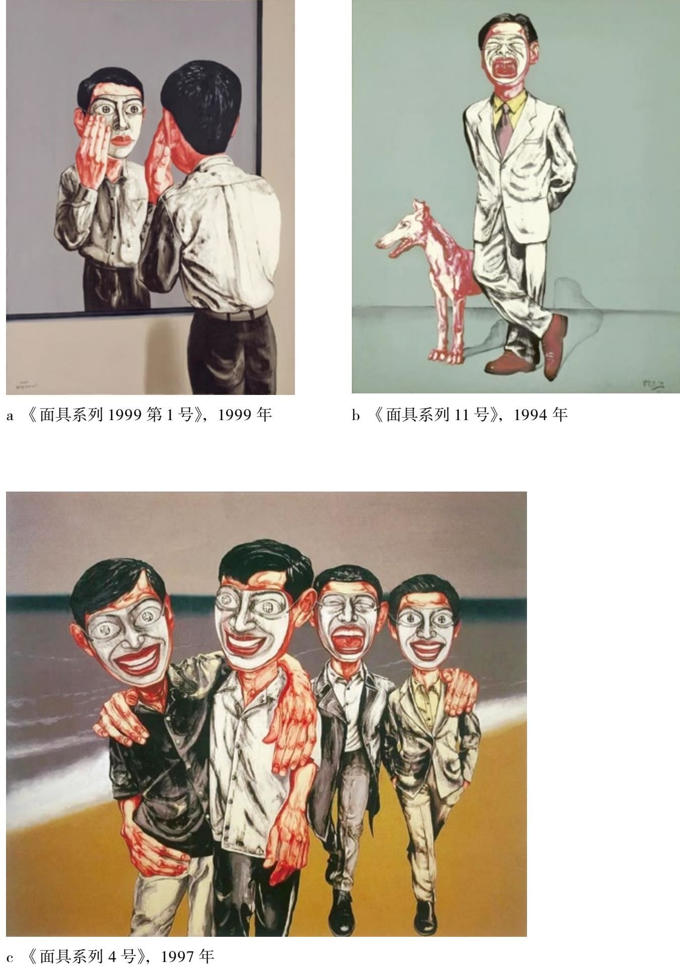 有的艺术家利用面具的模棱两可,有意模糊真实和伪装的区别。其中一位是中国当代油画家曾梵志(1964年生),他在20世纪90年代创作了数量众多的《面具系列》。画中的人物有时望着镜子里的自己,确定脸上确实戴着假面(图8.3a);有时显示出激动的情绪,但我们不知道这是真正的感情还是假面的修饰(图8.3b)。这些作品表达的是人类的异化和对自我(self)的怀疑,所绘的人物都是藏匿了个性的社会角色,通过假面与外界发生互动(图8.3c)。