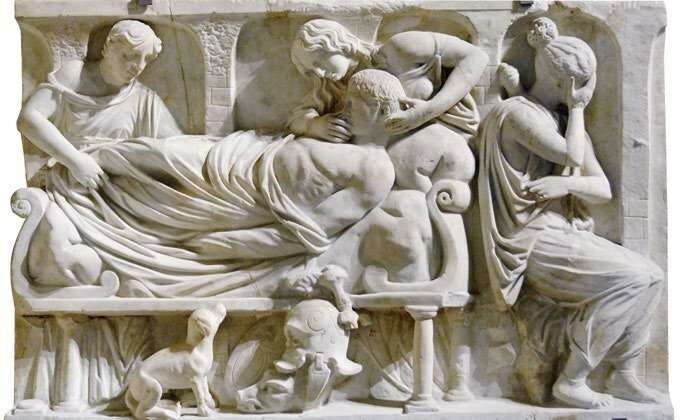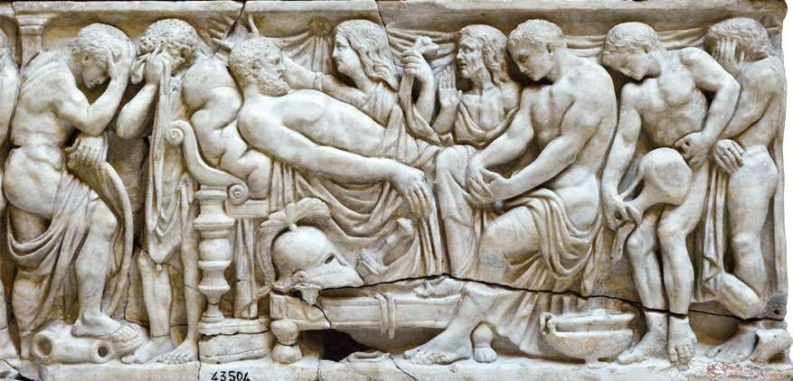 图8.7 阿喀琉斯哀悼帕特罗克洛斯,石棺浮雕,160年,意大利奥斯提亚古城考古博物馆藏