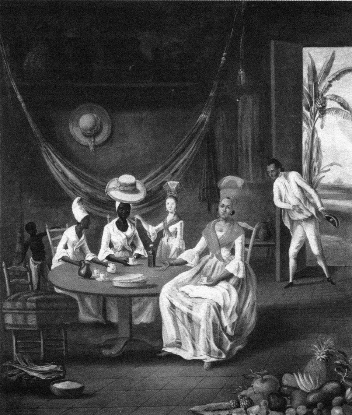 图33 黑人妇女上门拜访勒马叙里耶,勒马叙里耶是一名黑白混血妇女,图中还有她的白人女儿,图为勒马叙里耶在马提尼克岛的家,1775年。