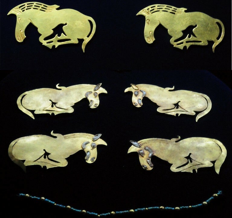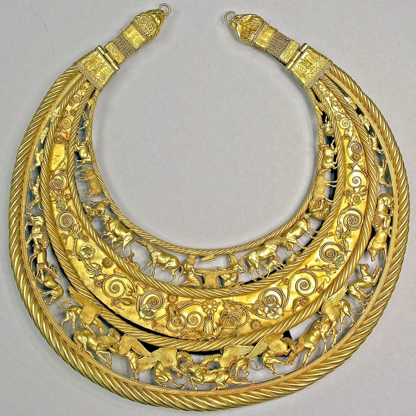 斯基泰风格胸饰,公元前4世纪。它呈月牙形,从风格上可分为三个部分,顶部部分反映了斯基泰人的日常生活,中间部分被认为代表了斯基泰人与大自然的联系,第三部分被认为代表了斯基泰人对宇宙和神话的信仰