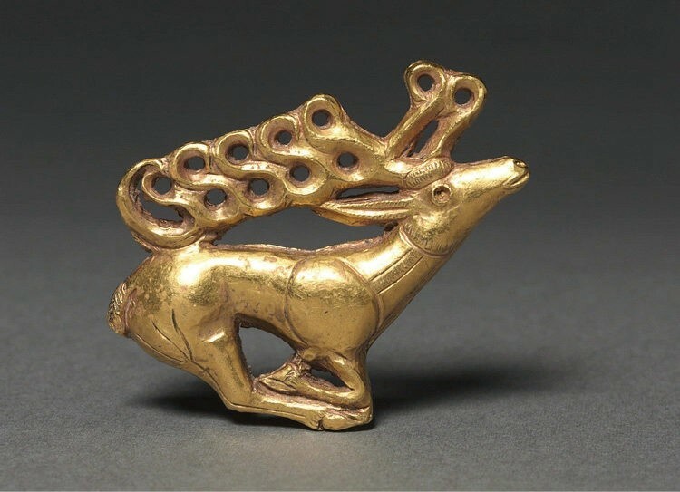 斯基泰雄鹿牌,公元前400—前300年。这个金鹿是在贝壳模具中铸造的。可以看出金鹿与鹿石上的图案一脉相承