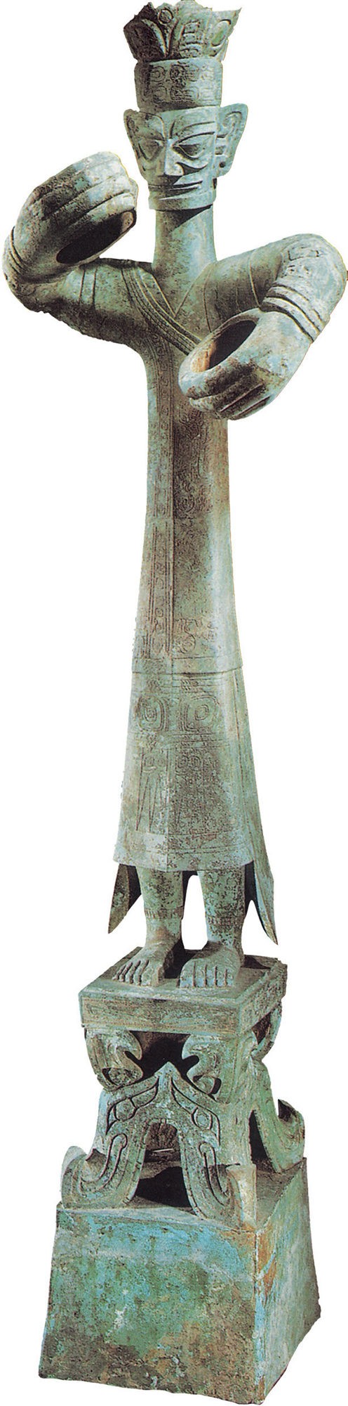 三星堆青铜立人像,商代晚期。人像头戴高冠,身穿窄袖与半臂式共三层衣,衣上纹饰繁复精丽,眼睛大到夸张,有拉长的身体和造型奇特的双臂动作,可能是集神、巫、王三者身份于一体的领袖人物。学者们尚未解开人像手中所持物品的谜团,有琮、璋、权杖、象牙等猜想