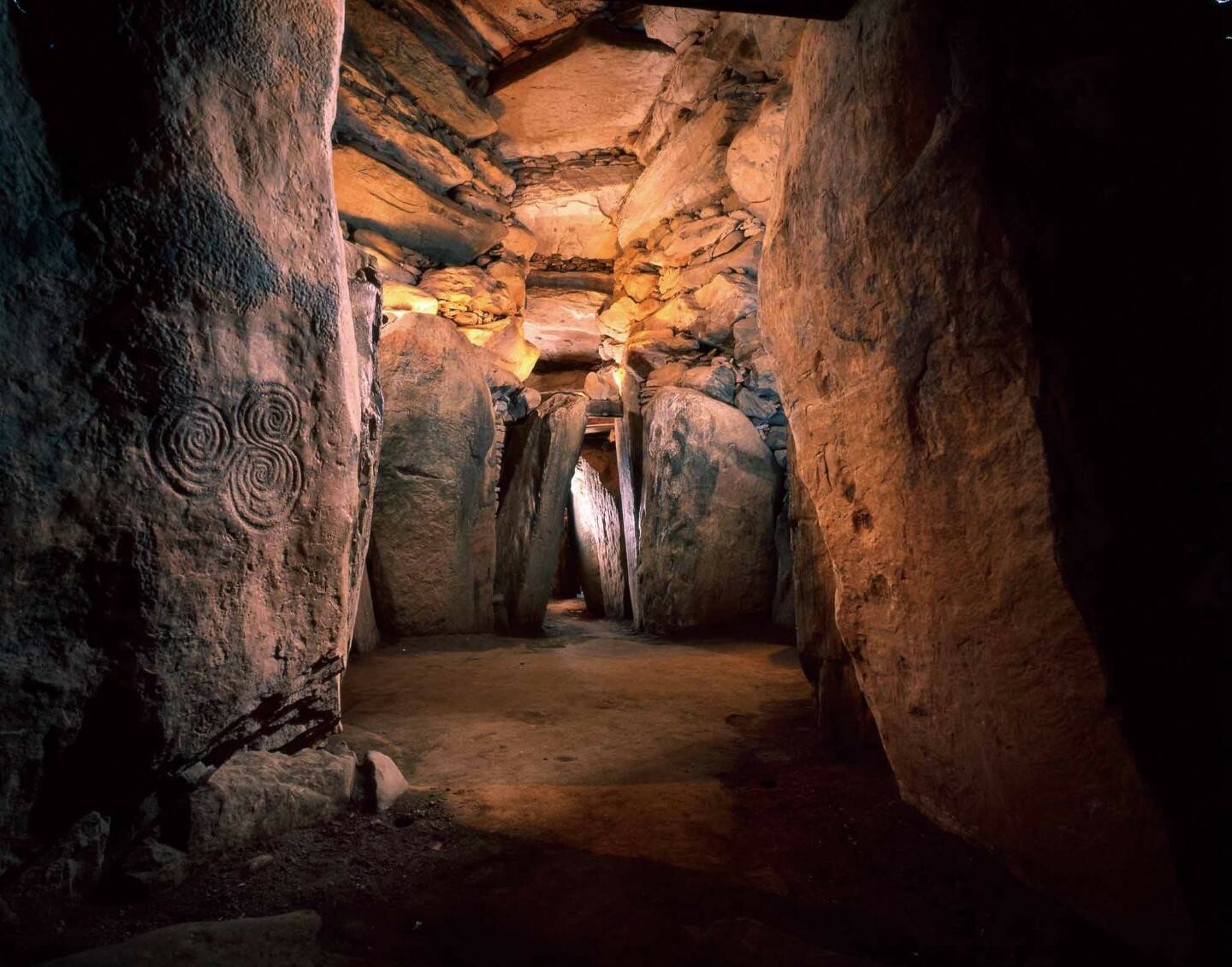 纽格兰奇遗址内部照片。遗址巨大的体量与方位的精确结合,体现出一种人类的决心,他们想要了解太阳在一年中最短的一天里的运动方式,以及大地由此产生的再生的力量。在通道入口上方有个屋顶开口。12月21日及这个日期前后几天的清晨,太阳光会穿过这个屋顶开口,慢慢照亮整个房间,直到最后落在屋子内部的一块石头上