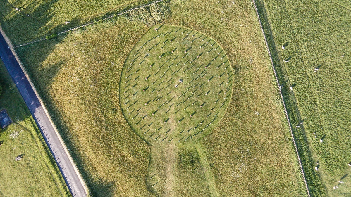 巨木阵俯瞰照片。巨木阵的主体结构都是木质的,这一点与巨石阵的石头形成了对比,可能反映了生命的循环,人类群体在东北部举行与生者相称的仪式,而在巨石阵之中礼拜死者
