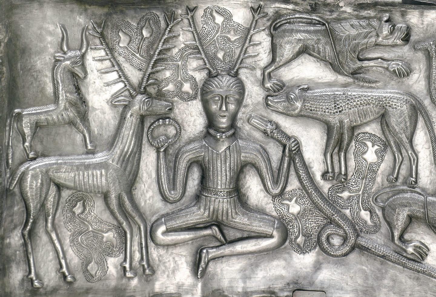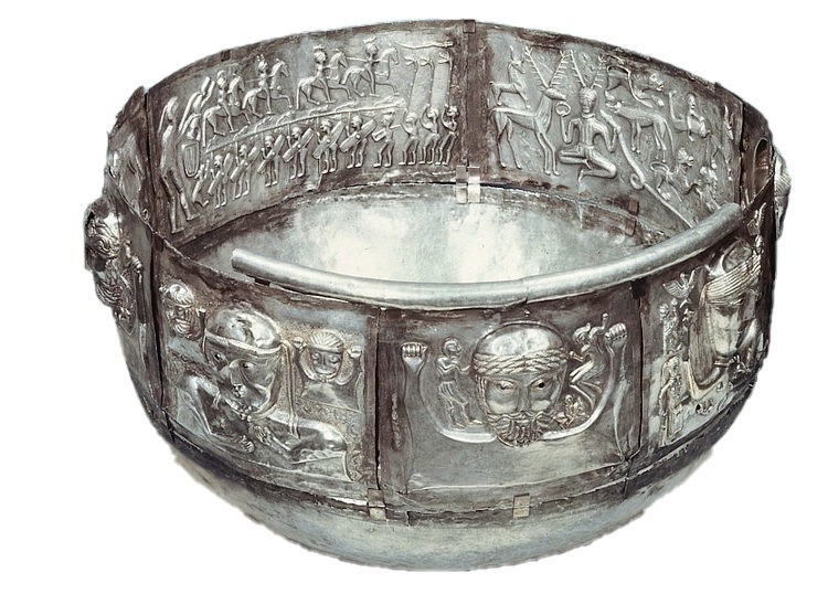 冈德斯特拉普坩埚。1891年发现于丹麦沼泽,它是一件珍贵铁器时代文物,显示出明显的凯尔特艺术和神话的影响。坩埚的浮雕描绘了神灵、动物、战士和祭祀仪式