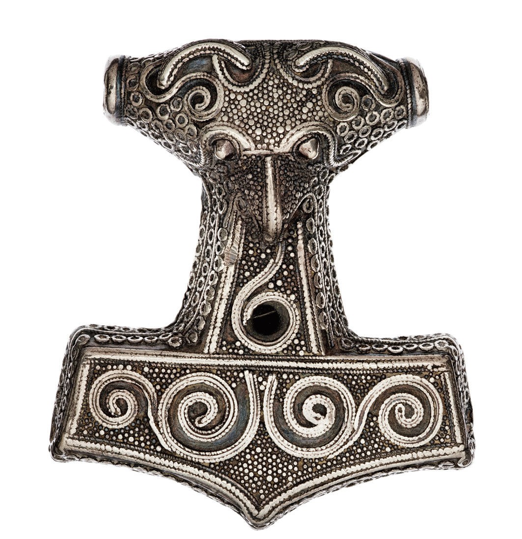 瑞典斯科纳某处发现的原始银质护身符雷神之锤——妙尔尼尔。妙尔尼尔是洛基在戏弄诸神与侏儒时意外得到的武器,后来被赠送给托尔使用。它堪称北欧神话中最强武器之一