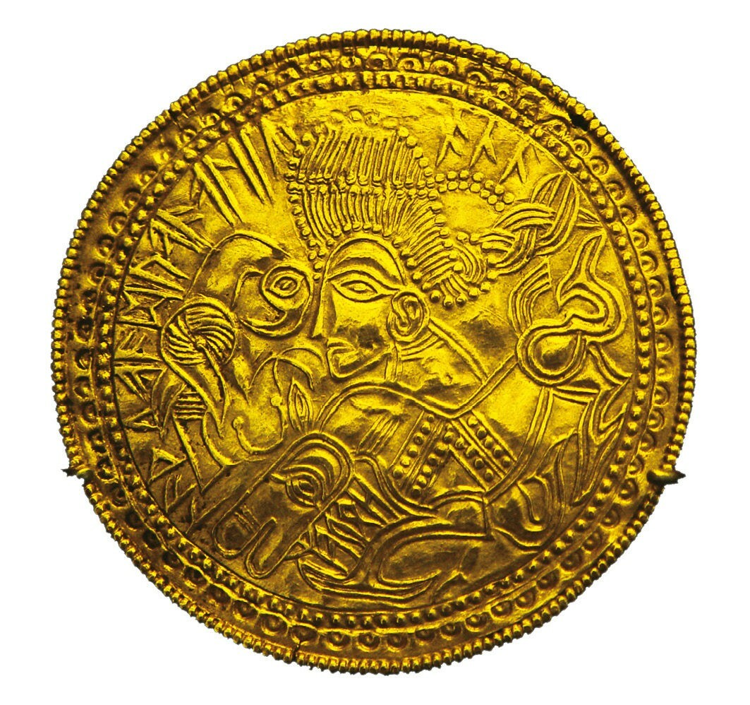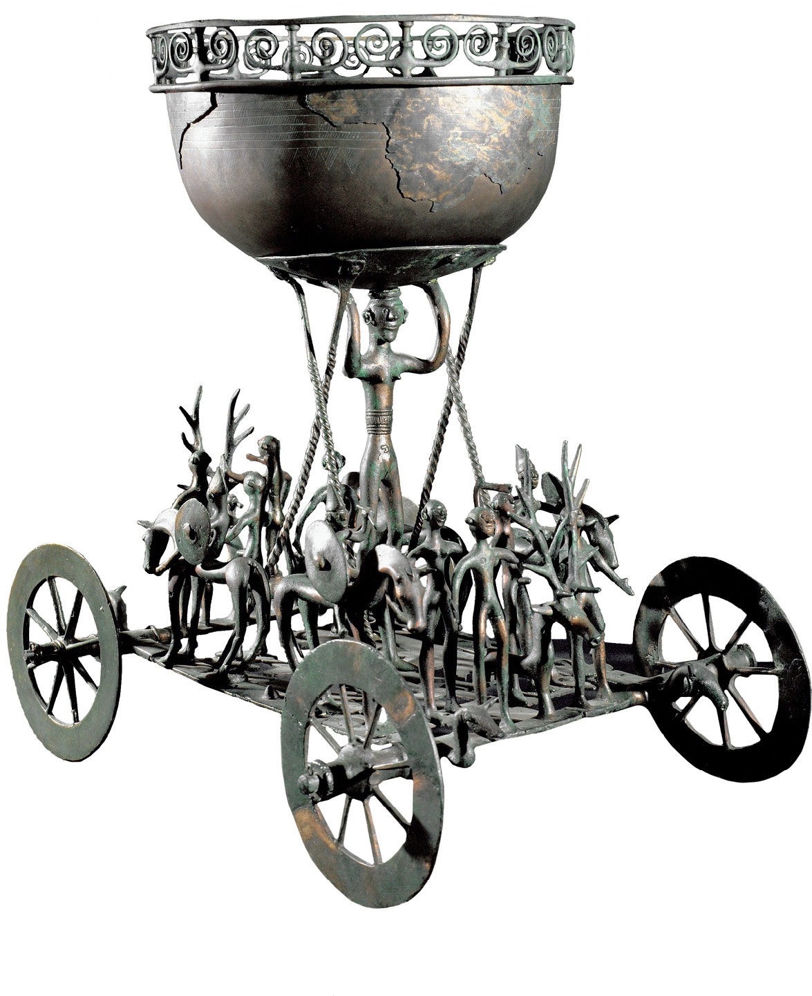特伦霍姆太阳战车,约公元前1400年,出土于丹麦特伦霍姆地区的沼泽。这架战车上有一个圆盘,它由两个青铜凸面组成,其中一面覆盖金箔,另一面则颜色暗沉,表现的或许就是太阳在白天和夜晚的两相。可能描绘了马拉着太阳在天空运行的神话场景