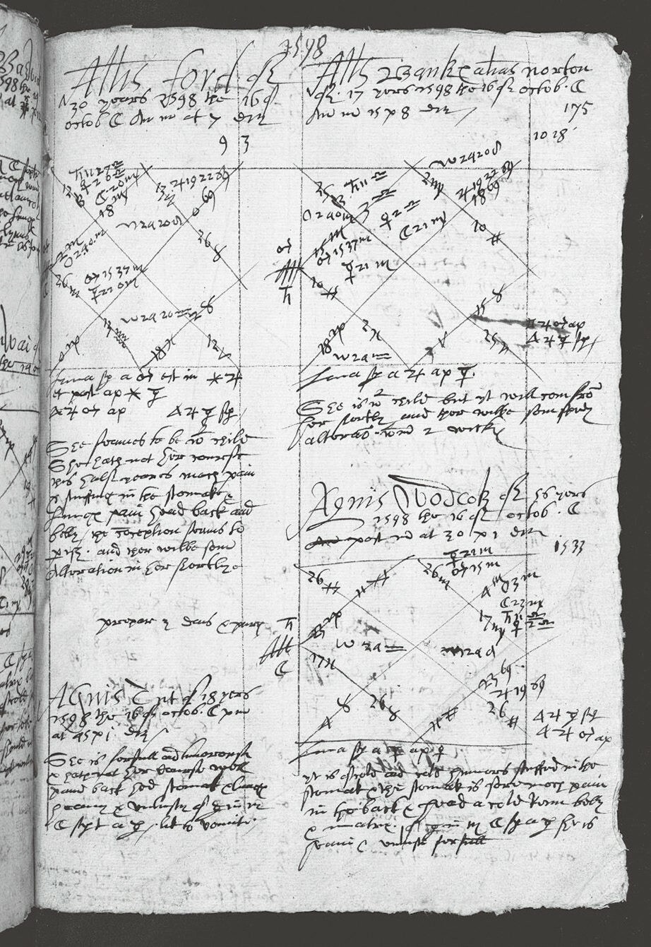 图9.2 西蒙·福曼的案例汇编中的一页,1598年10月16日。针对每一个咨询者,文件中都留下了一张菱形星盘,加上一些图示,同时还有问题及其分析