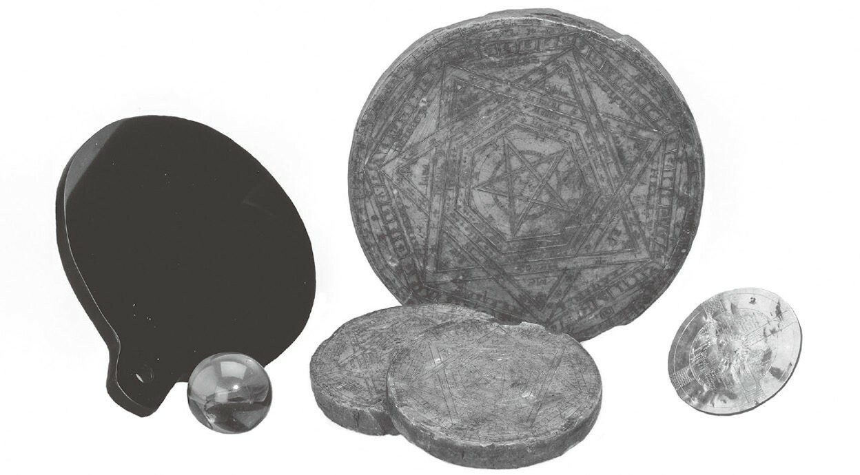 图9.3 约翰·迪伊的蜡版、水晶球、黑曜石镜子和金盘
