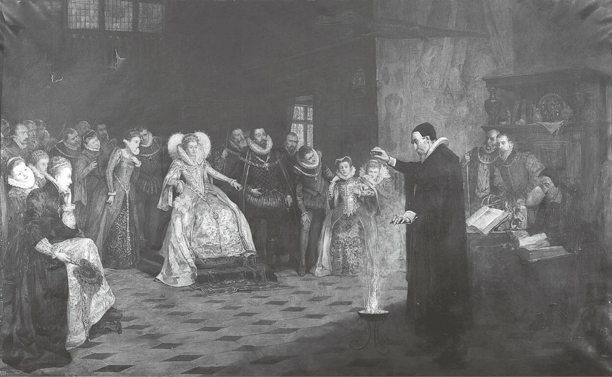 在图9.4中,我们可以直接看到约翰·迪伊的形象,他的个子很高,留着胡子,穿一身黑,身处他在莫特莱克的屋子里。迪伊正在做实验——他称之为“行动”——将两种元素混合在一起,要么引起燃烧,要么熄灭火焰,我们无法确定是哪一种。旁边聚精会神地看着的人是女王伊丽莎白一世和她宫廷中有权有势的成员。