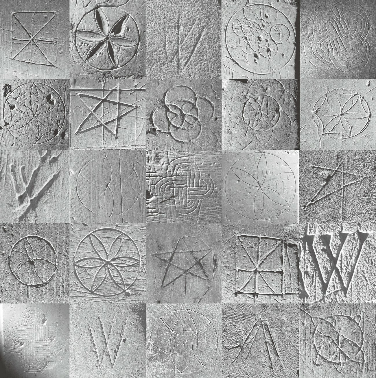 这类标记中最简单的就只是一个圆圈,但也有不少是菊轮(又称六瓣形),即部分的圆弧线条交叠呈现出六片花瓣的形状。(见图9.6)更多的标记是由两个重叠的V形成的,有时候则是一个M形的图案。除此之外,还有所谓的“棋格”图案——一个正方形或矩形,对角线在中间交叉。较为少见的还有万字符、复杂的绳结图案(所谓的“所罗门之结”)以及五角星形图案。六瓣形符号可能源于罗马世界,它们在不列颠岛的罗马堡垒中也有出现,只是其作用可能完全不同。可以肯定的是,从11世纪到15世纪,它们在教堂中十分常见。但很难确定它们是否集中出现在教堂的某些特定区域。保护性的标记可能会被画在石头、木头和灰泥上,但早期的灰泥要么已经不存在,要么后来被重新涂抹或画上新图案。另一个能经常看到图案的位置则是圣水池附近。诺福克郡的斯旺宁顿教堂就留有各种形式的涂刻痕迹,包括题字和几何图案;后者有不少都集中在圣水池原来的位置,东英格兰的其他教堂中也可见类似的分布方式。几何图案常常被说成圆规所绘,但考虑到它们无处不在,也有可能是用某些类似剪刀的常见工具绘制的,它有两片由金属环连接的刀刃;人们可以将其中一片刀刃抵在一个点上,用另一片刀刃画出部分或整个圆形。剪刀是家庭中常见的物品,在绘画或墓葬中常常与女性联系在一起。