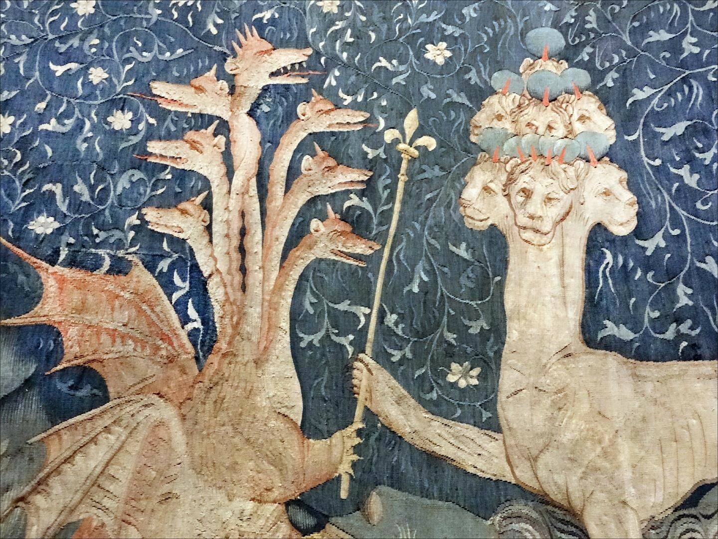 《天启挂毯》局部(约1377—1382年)。《天启挂毯》是一套大型的中世纪法国挂毯,由安茹公爵路易一世委托订制。这幅局部图属于第III.40板块,描绘了撒旦(龙)将权杖交给海怪的故事