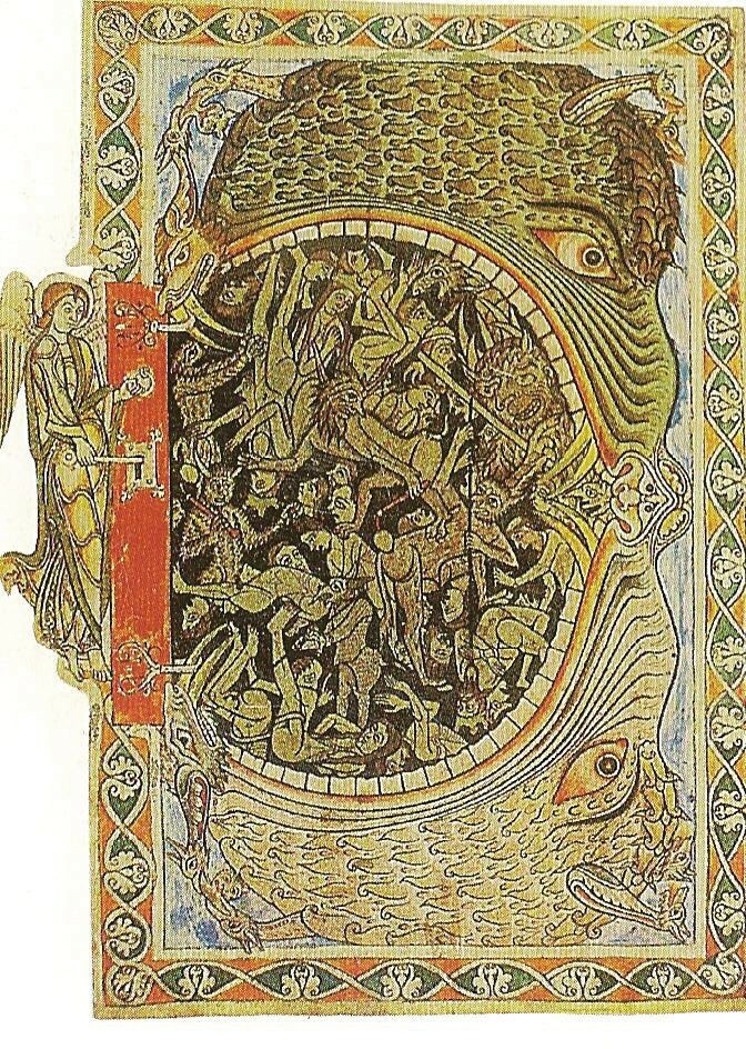 《地狱之口》(约1150年),《温彻斯特诗篇》插图。图中描绘了最后审判,被诅咒的人被地狱之口吞噬,一位天使用钥匙锁住地狱大门的场景