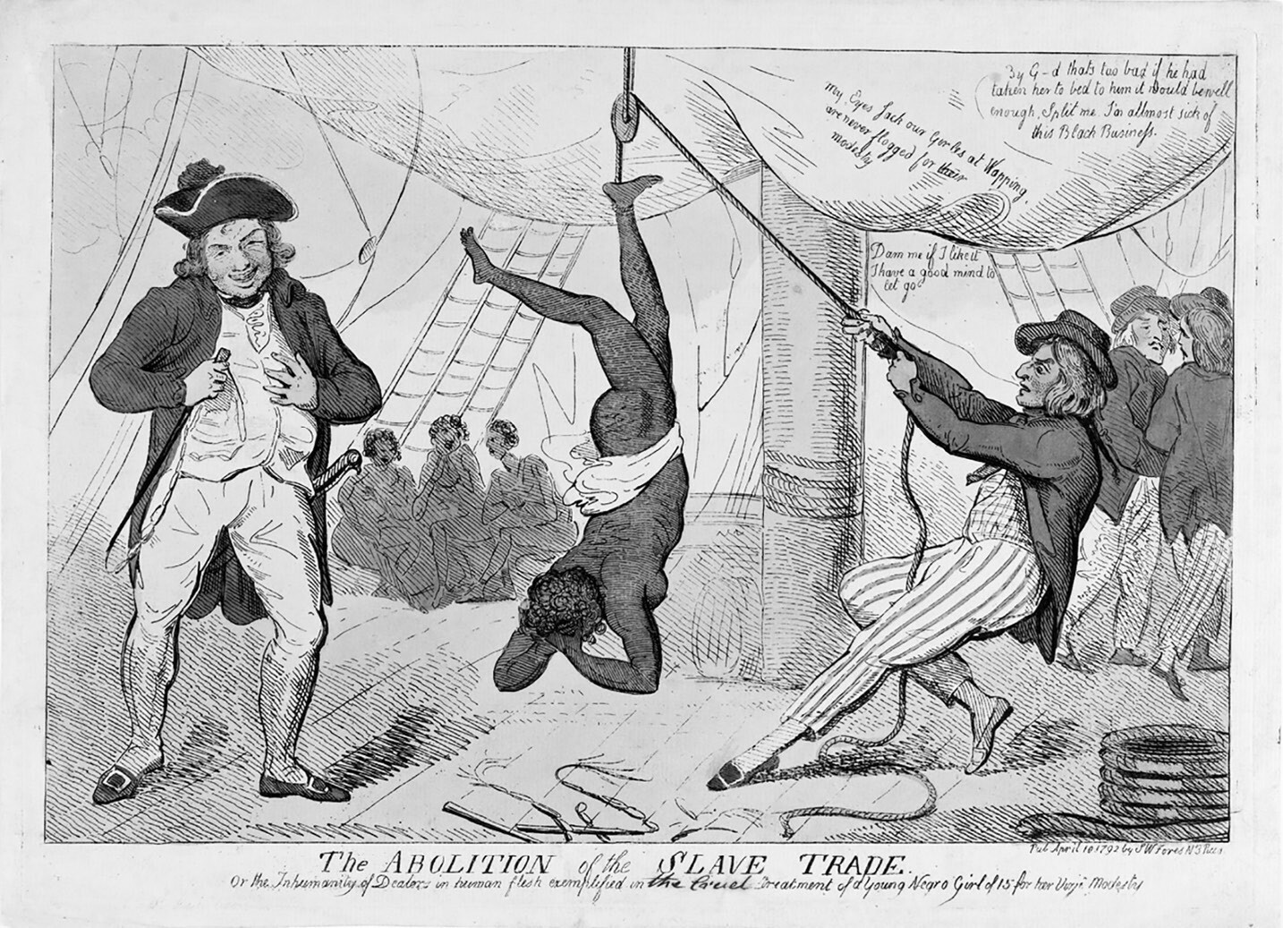 前奴隶贩子约翰·牛顿在以第一人称撰写的《真实的叙事》一书中,讲述了自己尽管深爱妻子波莉,却仍对被奴役的非洲妇女抱有不轨的想法,并通过只喝水和戒食肉类来抑制这些念头。其他作品则显示,许多海员没有这种顾忌,他们对非洲人进行了性侵犯。这些暴行被详细记录了下来。1792年出版的《费利克斯·法利的布里斯托尔日记》《Felix Farley’s Bristol Journal》描述了布里斯托尔的运奴船船长约翰·金伯是如何惩罚一个因生病不吃东西的15岁非洲人的,约翰将她倒吊起来,然后猛烈鞭打她,5天后,她因伤势过重而死亡。艾萨克·克鲁克香克的一幅讽刺漫画描绘了这个场面:船长金伯残忍地看着这个赤身裸体的女孩被倒吊起来,她绝望地抱着头,而愤怒的水手正准备鞭打她,后方还有3个哭泣的女奴。在这幅漫画的下方写有一个标题,即“废除奴隶贸易”。