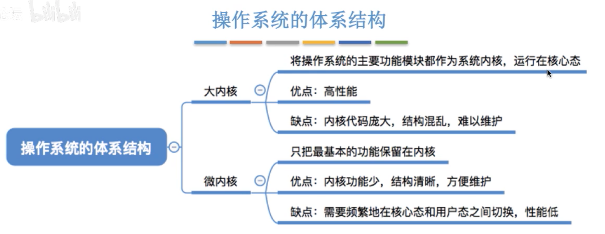 #操作系统 的大内核、微内核:只把最基本的功能保留在内核优点:内核功能少,结构清晰,方便维护缺点:需要频繁地在核心态和用户态之间切换,性能低