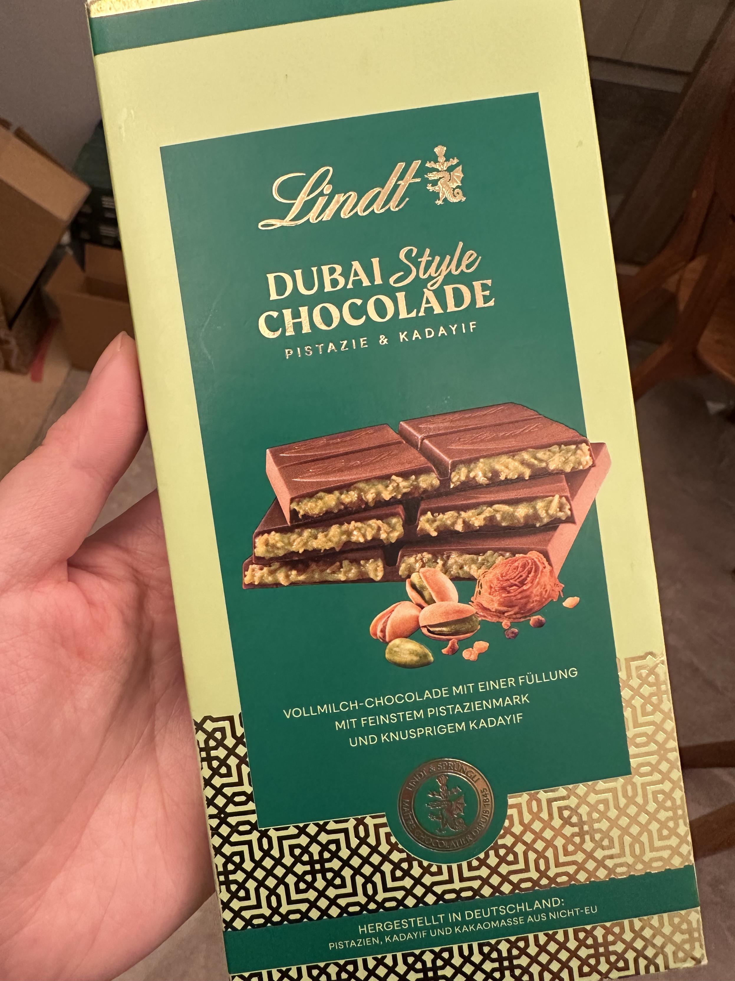 今天和母上逛盒马,看到了正在打6折的瑞士莲迪拜巧克力,还有15天过期,没有标原价多少。因为母上天天在吃播里看主播吃迪拜巧克力,很想尝试,加上我也看美食博主复刻过,有点好奇,于是我们就买了。