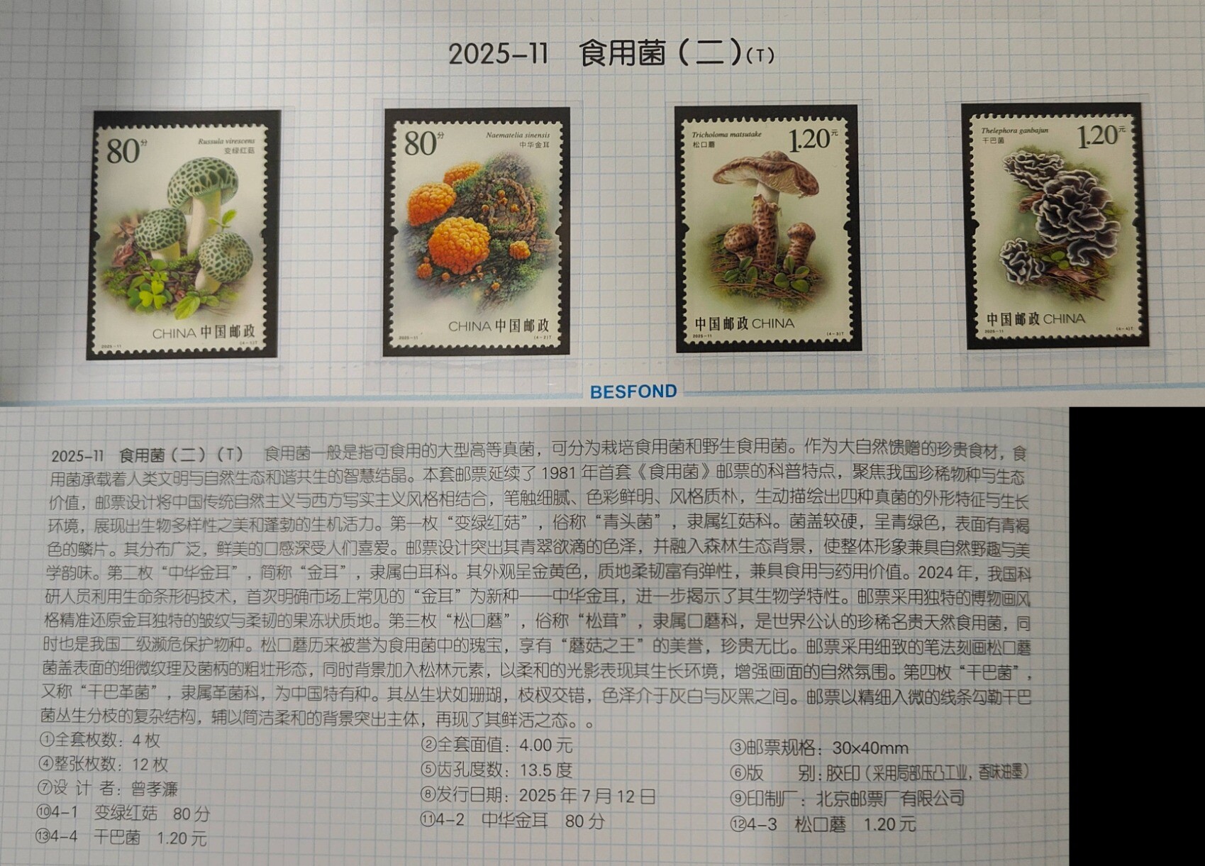 发行了四枚《食用菌(二)》,有变绿红菇、中华金耳、松口蘑和干巴菌,还是曾孝濂画的呢,非常好看!我很喜欢第一枚变绿红菇,呆头呆脑的,非常可爱!这套邮票是对 1981 年首套《食用菌》邮票的延续,现在邮票发行搞这种超长连续剧,我觉得很不错,2023 年发行的《昆虫(二)》也是 1992 年《昆虫》的延续.