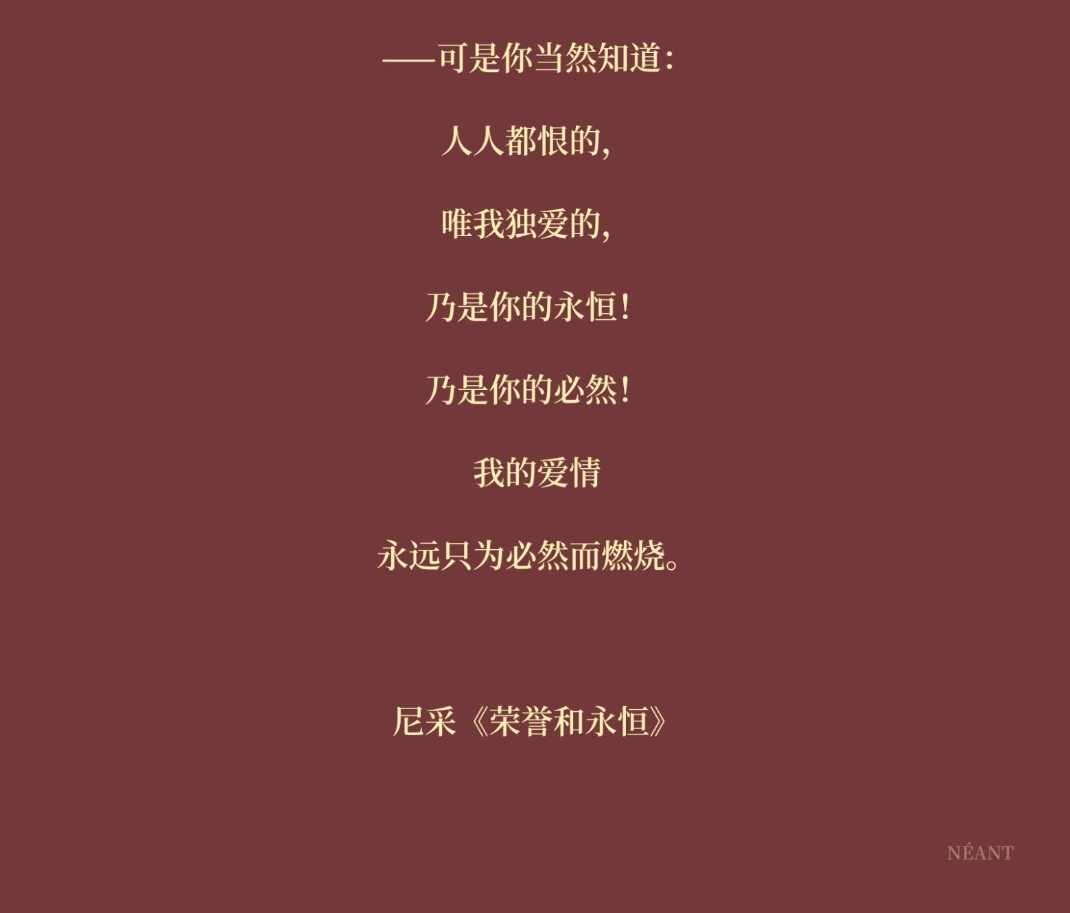 ——可是你当然知道:人人都恨的,唯我独爱的,乃是你的永恒!乃是你的必然!我的爱情永远只为必然而燃烧。