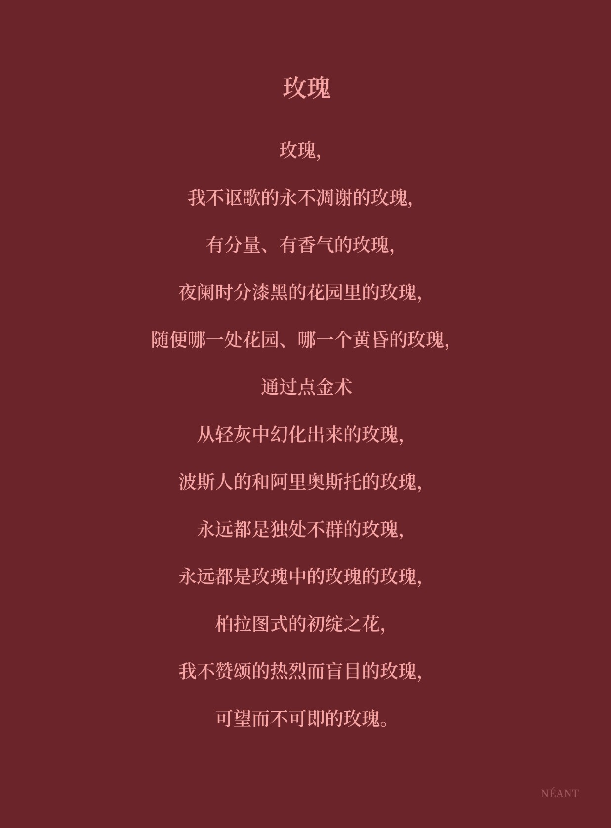 玫瑰,我不讴歌的永不凋谢的玫瑰,有分量、有香气的玫瑰,夜阑时分漆黑的花园里的玫瑰,随便哪一处花园、哪一个黄昏的玫瑰,通过点金术从轻灰中幻化出来的玫瑰,波斯人的和阿里奥斯托的玫瑰,永远都是独处不群的玫瑰,永远都是玫瑰中的玫瑰的玫瑰,柏拉图式的初绽之花,我不赞颂的热烈而盲目的玫瑰,可望而不可即的玫瑰。