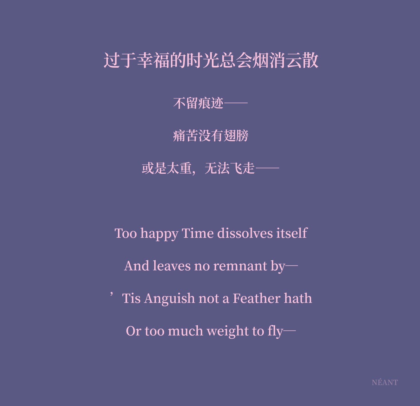 Too happy Time dissolves itselfAnd leaves no remnant by—’Tis Anguish not a Feather hathOr too much weight to fly—