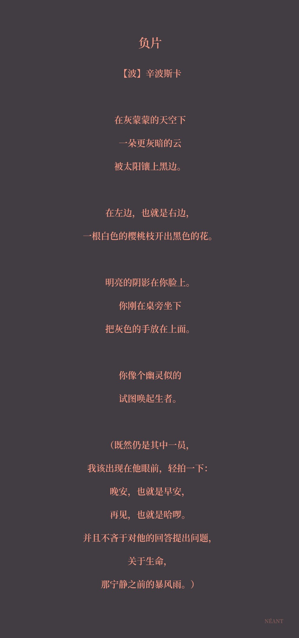(既然仍是其中一员,我该出现在他眼前,轻拍一下:晚安,也就是早安,再见,也就是哈啰。并且不吝于对他的回答提出问题,关于生命,那宁静之前的暴风雨。)