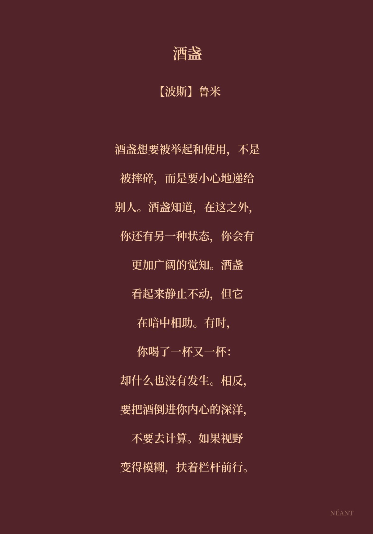 酒盏想要被举起和使用,不是被摔碎,而是要小心地递给别人。酒盏知道,在这之外,你还有另一种状态,你会有更加广阔的觉知。酒盏看起来静止不动,但它在暗中相助。有时,你喝了一杯又一杯:却什么也没有发生。相反,要把酒倒进你内心的深洋,不要去计算。如果视野变得模糊,扶着栏杆前行。