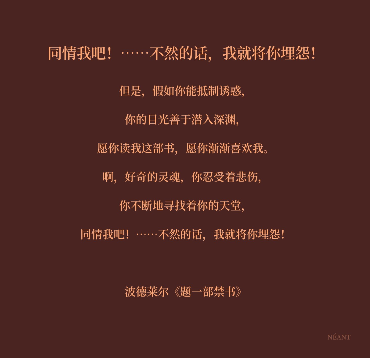 但是,假如你能抵制诱惑,你的目光善于潜入深渊,愿你读我这部书,愿你渐渐喜欢我。啊,好奇的灵魂,你忍受着悲伤,你不断地寻找着你的天堂,同情我吧!……不然的话,我就将你埋怨!