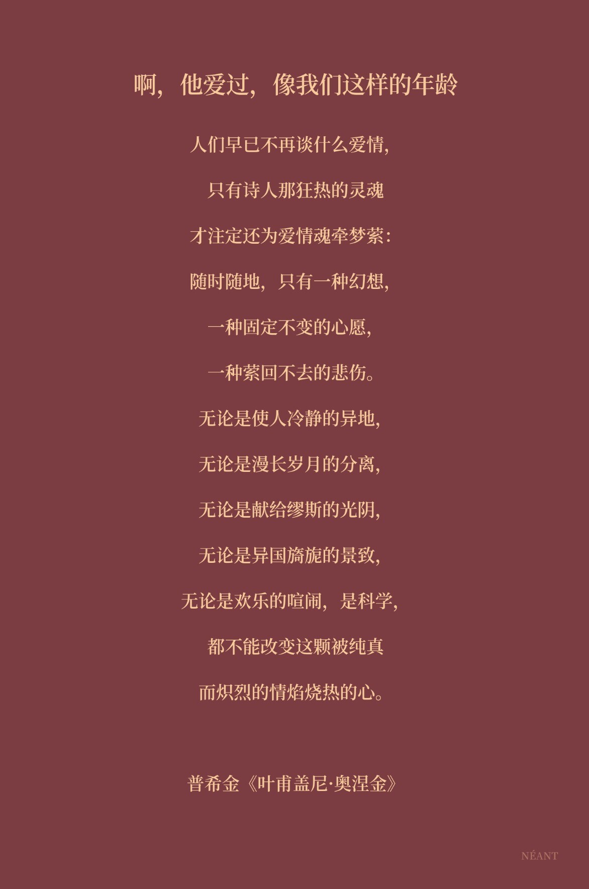 啊,他爱过,像我们这样的年龄人们早已不再谈什么爱情,只有诗人那狂热的灵魂才注定还为爱情魂牵梦萦:随时随地,只有一种幻想,一种固定不变的心愿,一种萦回不去的悲伤。无论是使人冷静的异地,无论是漫长岁月的分离,无论是献给缪斯的光阴,无论是异国旖旎的景致,无论是欢乐的喧闹,是科学,都不能改变这颗被纯真而炽烈的情焰烧热的心。