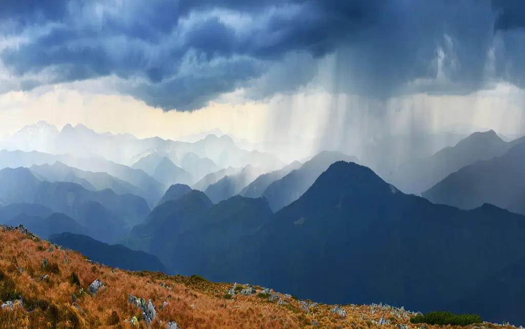 山客龙钟不解耕,开轩危坐看阴晴。前江后岭通云气,万壑千林送雨声。海压竹枝低复举,风吹山角晦还明。不嫌屋漏无乾处,正要群龙洗甲兵。