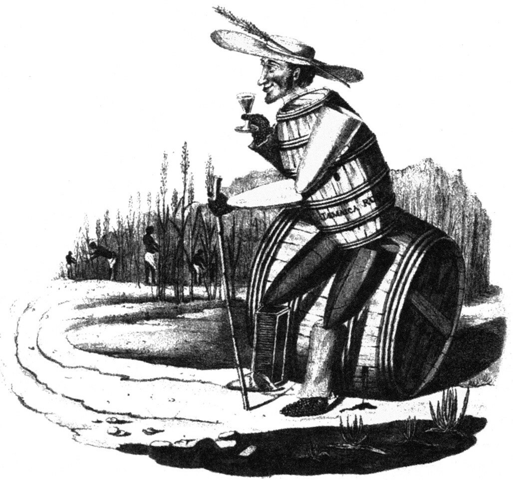 图29 《甘蔗人汤姆》(Tom Sugar Cane)是19世纪英国插画家乔治·斯普拉特所绘的讽刺漫画。汤姆是西印度群岛的一名糖料种植园主,他本人由蔗糖贸易的工具和产品组成,包括一根甘蔗秆、一个桶、一杯朗姆酒和金属刀具。在他身后,奴隶们在甘蔗田里干活。