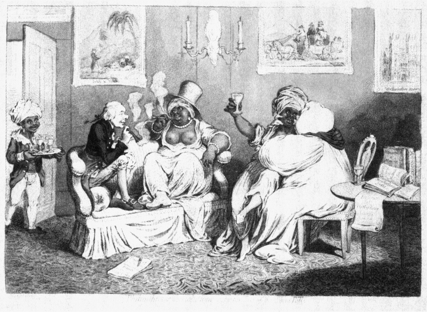 图39 《慈善的慰藉》(Philanthropic Consolations)。在《废除奴隶贸易法案》被否决后,詹姆斯·吉尔雷对废奴主义者威廉·威尔伯福斯和塞缪尔·霍斯利主教的野蛮描绘,这两人被刻画为堕落的浪子,他们对被奴役的黑人的爱本质上是情色的。