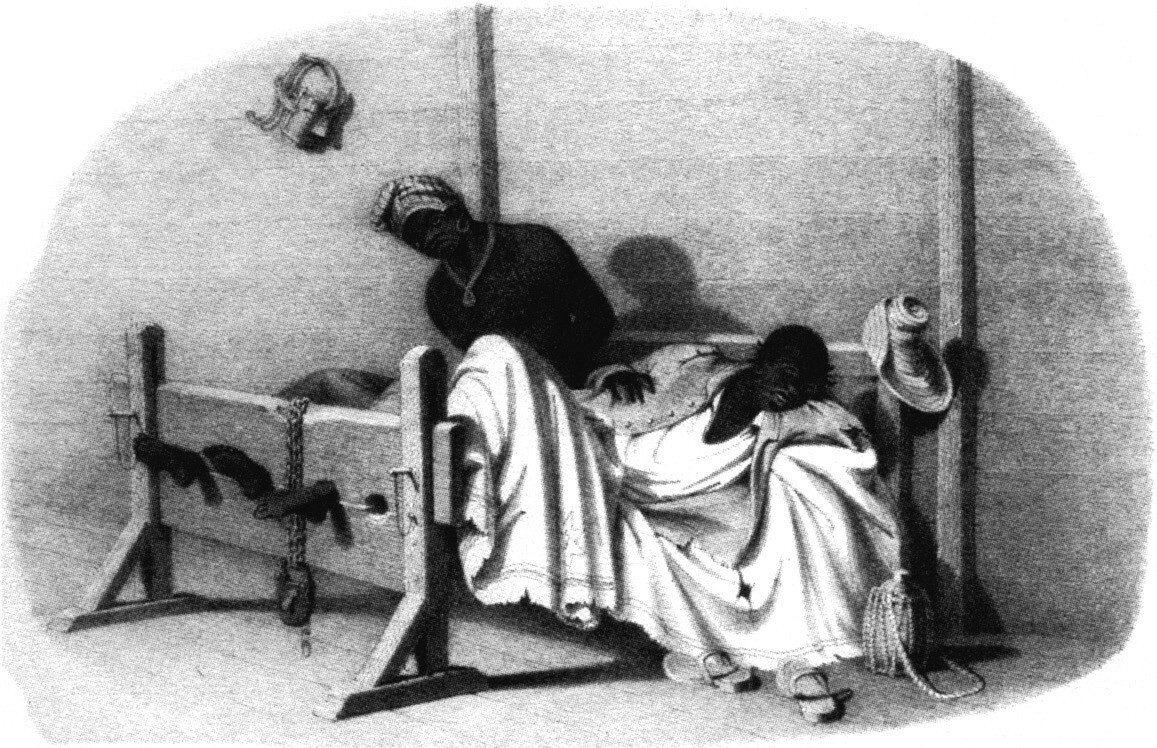 图41 两个精疲力竭的奴隶被迫戴上枷锁,姿势十分痛苦,这是一种常见的惩罚。其中一个奴隶试图睡觉。