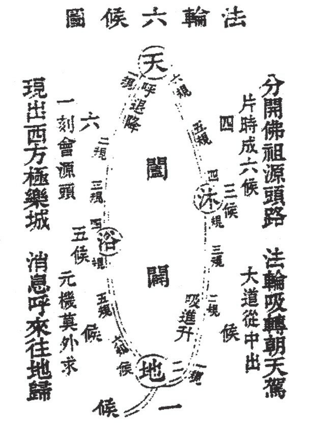 [此章首云:“玉清留下逍遥诀,四字凝神入炁穴。六月俄看白雪飞,三更又见日轮赫。水中吹起藉巽风,天上游归食坤德。更有一句玄中玄,无何有乡是真宅。”盖道之玄妙,由无生有。因神与气凝集既久,则虚无之中生出一点真火,斯时神愈静,而火愈旺。火旺之景,则如六月炎暑之象。以旺火而煎坎水,水汽热极则沸点上腾,如雪飞相似,即“六月俄看白雪飞”之义也。然水因被火熏蒸,则真炁发动,但阴静则阳动,正如夜半之景,故仙家谓之活子时。斯时以意摄气,使之逆升顺降,如日轮升转相似,故曰:“三更又见日轮赫。”惟运转之法,又须假呼吸吹动命门之火,方得将真炁摄归原处,故诗中谓之“水中吹起藉巽风”。因先天一炁既得后天呼吸吹动,动由尾闾逆上乾顶,径乾宫,下重楼,顺行腹内而温养,故曰“天上游归食坤德”矣。真炁既归于虚无之所,久之气体充足,身心快乐。然若非由法轮运转之功,何能到得逍遥境域也。盖其要总由于凝神返照,神火静极,催动虚危穴内水中火发之故,即祖师所谓“更有一句玄中玄,无何有乡是真宅”耶。盖篇中此义,因学者功夫至此已造入玄奥之境,第恐不知煅炼之法,而金丹难以成就,故祖师将仙佛不传之秘点揭破。原学者凝神住于炁穴之时,静极则杳冥之中,由无生有,即太乙金华发现矣。斯时则有识光、性光之分,故曰:感于物而动,以之顺出生人,谓之识光。学者当真炁充足之时,若不令其顺出而逆之,则谓之性光。须假河车轮转之法,轮转不已,则真炁滴滴归根,而车住轮停,身清气爽矣。然轮转一次,则谓之一周天,即邱祖所谓之小周天也。倘不俟气足而采之,则时尚嫩而药物不结;若气充而不采,则失之老,而金丹难成。不老不嫩,用意摄取,斯其时矣。然斯时佛祖谓之色即是空,即炼精化气之义也。学者若不明此理,以之顺出,则气化为精,是谓空即是色矣。但凡夫以形骸交合,先乐而后苦,精泄则体倦而神惫,非若仙佛以神气交合,先清而后爽,精化则体畅而身舒矣。世传彭祖寿活八百八,系御女以养生,斯言误矣。不知实乃用神气锻炼之法也。因丹书之比喻,喻离火为姹女,以坎水喻婴儿,故疑彭祖用男女采补之法,以讹传讹,误却后生矣。