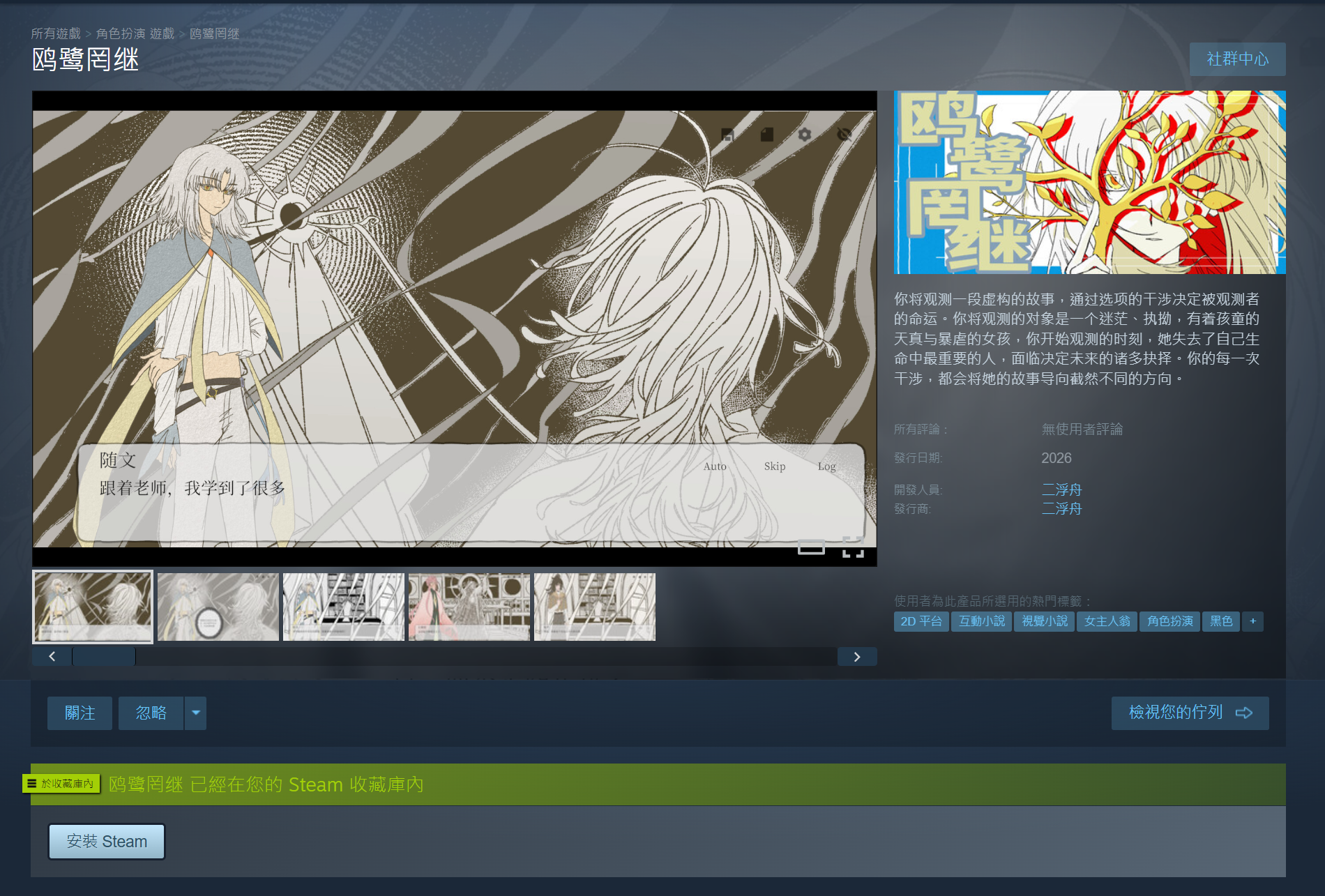 各位香油好!由二浮舟创作的独立视觉小说《鸥鹭罔继》的商店页上线steam了! :cafe_otter_homes: